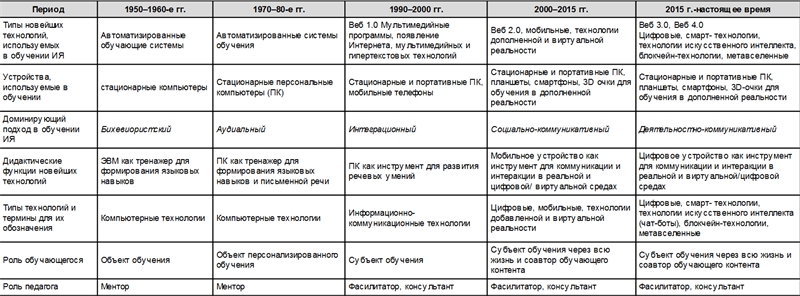 Еще в 1997 году М. Воршер выделил три этапа использования компьютерных технологий в преподавании иностранных языков − бихевиористский, коммуникативный и интеграционный [Warschauer, 1997]. Для каждого этапа характерен определенный уровень развития технологий и соответствующий метод обучения. Сегодня, в связи с появлением новых цифровых технологий, изменениях в подходах к обучению, в связи переходом от знаниевой парадигмы обучения к компетентностно-деятельностной, данная классификация может быть дополнена, расширена и уточнена (см. табл. 1).