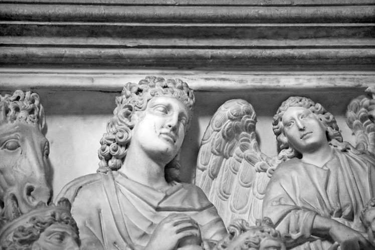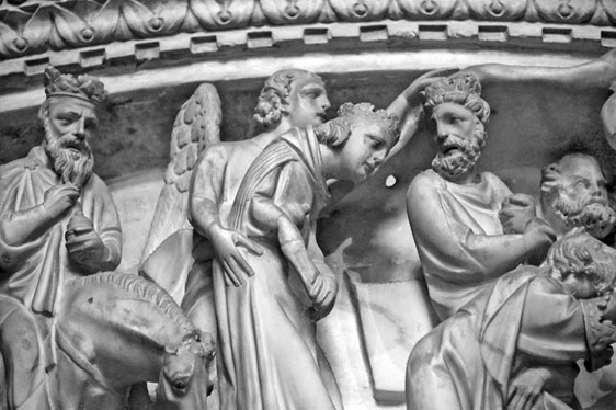 Этот пизанский барельеф интересен еще одним обстоятельством. Женщину Мельхиор обнимает одной рукой ангел с крыльями. Одна его рука обхватывает Мельхиор сзади, а другая рука возложена на голову Валтасара. При этом, Мария, Иисус и Иосиф показаны внутри пещеры. Надо сказать, мы впервые увидели сцену Поклонения Волхвов, где ангел как бы обнимает одновременно Мельхиор и Валтасара. На самом деле здесь всё понятно. Мы неоднократно сталкивались с тем, что на многих старинных изображениях Валтасар и Мельхиор выделены, «объединены» тем или иным способом. В частности, обычно стоят рядом. Например, на Кельнском саркофаге Волхвов, рис. 15, Валтасар и Мельхиор охвачены одной аркой, чем, очевидно, подчеркивается их родство, близость. Скорее всего, указывали на тот факт, что Малка-Мельхиор была матерью Владимира-Валтасара. Они были родственниками. А Каспар, вероятно, их родственником не был. Поэтому его изображали отдельно, в другой позе, не под одной аркой с Мельхиор и Валтасаром. В случае с пизанской кафедрой, Джованни Пизано объединил и выделил пару – Мельхиор-Валтасар тем, что изобразил ангела, обнимающего этих двух Волхвов. А вот Каспара ангел не обнял.