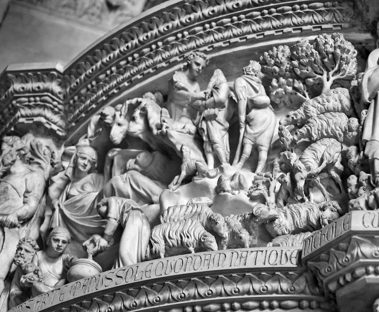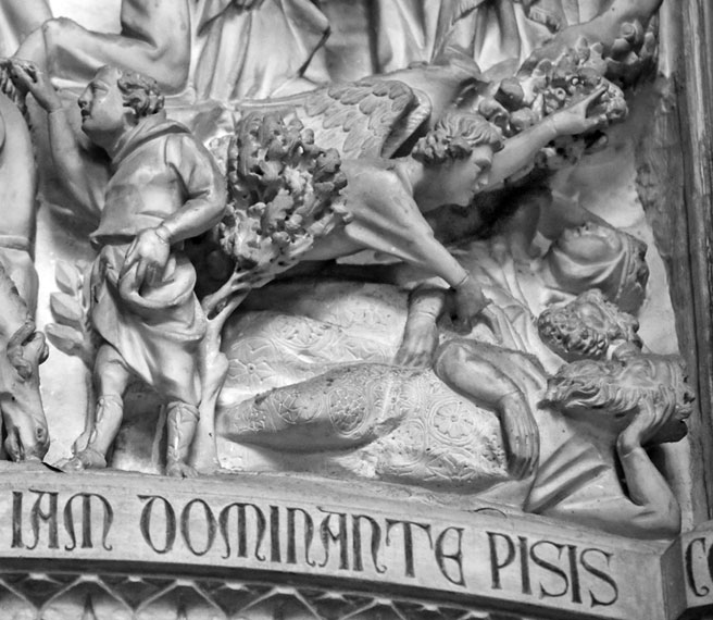 БАРЕЛЬФ РОЖДЕСТВА ХРИСТОВА. Стоит отметить, что на кафедре Пизанского собора изображено также Рождество Христово вместе с Поклонением нескольких Пастухов Младенцу Иисусу, рис. 33, рис. 34. Здесь тоже мы видим «мульфильм», развертку во времени. Двое Пастухов показаны справа вверху. Перед ними – Ангел, возвещающий Пастухам весть о Рождестве. Голова у скульптуры одного из этих Пастухов, к сожалению, отбита. Затем, уже слева, показано, как трое Пастухов явились на поклонение Иисусу. Они изображены тут над сводом пещеры, где находятся Мария, Младенец, Иосиф и служанки. Здесь трудно сказать, была ли среди этих Пастухов женщина. Таким образом, создатель кафедры – Джованни Пизано отразил оба евангельских рассказа. А именно, Поклонение Волхвов (из Матфея) и Поклонение Пастухов (из Луки), уже не понимая, что на самом деле это – одна и та же история. Забыл (приказали забыть).