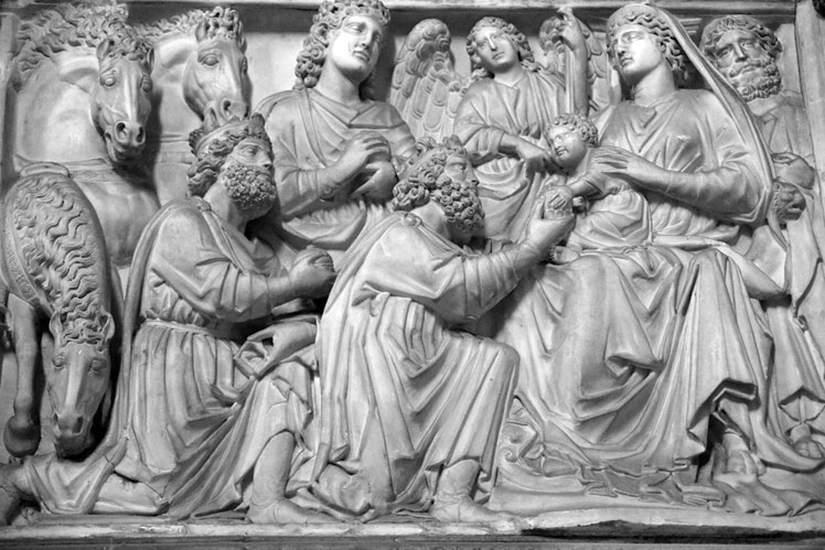 Рис. 37. Поклонение Волхвов, изображенное на кафедре баптистерия в Пизе.