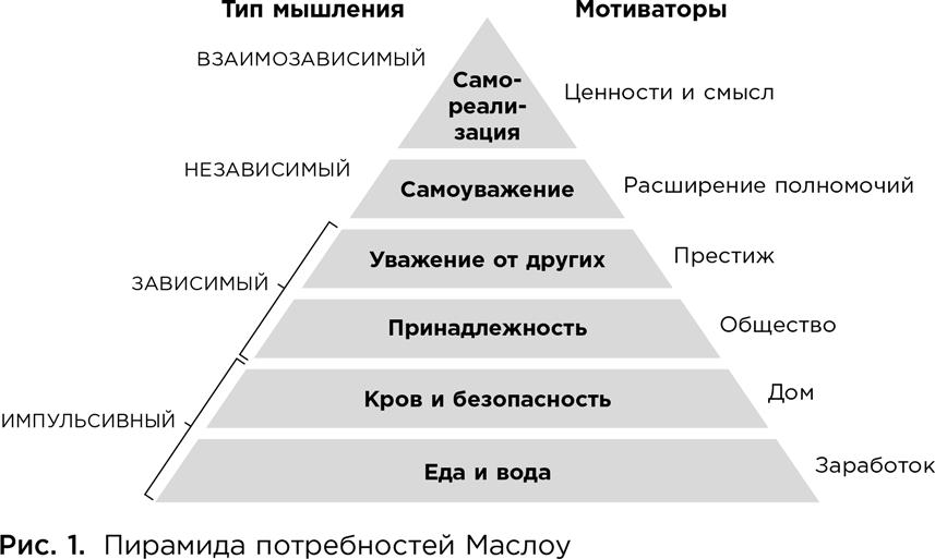 В деловых кругах Маслоу известен прежде всего как создатель пирамиды человеческих потребностей. В основе этой модели базовые потребности в еде и воде, и она предполагает, что, покуда эти потребности не будут удовлетворены, мы не станем заботиться ни о чем другом (разве что о покупке мобильного телефона!). Но едва обеспечив себя водой и пищей, человек переходит к более высокому уровню потребностей и старается обеспечить себя одеждой, крышей над головой и безопасностью. И опять-таки, удовлетворив хотя бы отчасти эти физические потребности, мы сосредоточиваемся уже на социальных нуждах, на потребности принадлежать к какой-либо группе. Отчасти эту потребность удовлетворяет семья, но дальше нам понадобятся пабы, клубы и команды.