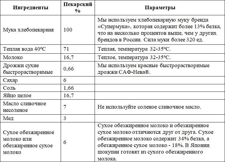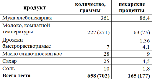 Ниже мы приведем несколько вариантов приготовления молочного хлеба. Количество ингредиентов будем приводить исходя из одной буханки. Также будем показывать и пекарские проценты, которые легко помогут вам рассчитать количество необходимых ингредиентов для приготовления хлеба.