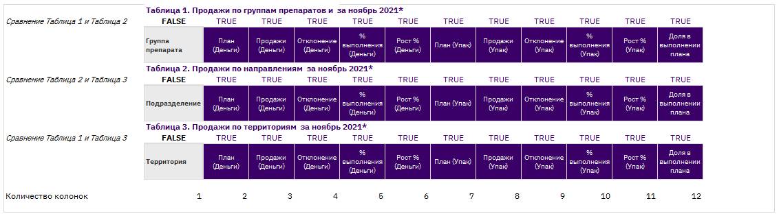 Итак, мы с тобой видим, что 11 колонок в каждой из трех таблиц называются одинаково – «Истина», и у первой колонки названия отличаются, здесь стоит «Ложь».