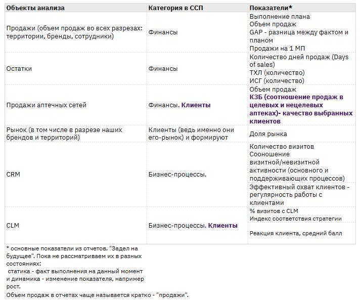 Таблица №3 Объекты анализа и его категория в ССП.