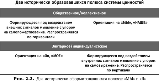 На рис. 2.3 показаны два психосоциальных полюса, которые формировались на протяжении истории: ценностные системы, одна из которых ориентирована на «МЫ», а другая – на «Я».