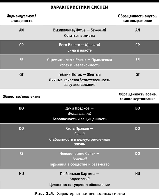 Изначально для обозначения человеческих систем Грейвз и Бек использовали пары букв (AN, BO, CP), и им говорили, что это вызывает некоторые сложности. Затем они стали применять цифровую нумерацию – 1, 2, 3 – и услышали, что при этом создается впечатление, что цифры, описывающие бóльшие числа, соответствуют системам, которые как бы лучше тех, что обозначены цифрами, описывающими числа меньшие (так, видимо, заявил бы и Чарльз Дарвин). Тогда ученые попробовали дать системам условные названия – Племенная, Эгоцентрическая, Абсолютистская и т. д. – и подверглись критике за упрощенчество, ведь такие сложные системы нельзя охарактеризовать одним словом. Более предпочтительным вариантом могли стать словосочетания – Духи Предков, Боги Власти, Сила Правды, но тут тоже таились семантические ловушки. Тогда Бек начал использовать цвета – они были нейтральными, могли сочетаться, образовывая слои и оттенки и просто привлекательно выглядели. Теплыми цветами стали маркироваться ценностные системы, в центре которых находились факторы индивидуализма/самовыражения. Так, код AN стал БЕЖЕВЫМ, код СР – КРАСНЫМ, код ER – ОРАНЖЕВЫМ, а код GT – ЖЕЛТЫМ. Те человеческие системы, в центре которых находилось коллективное/общественное, начали обозначаться холодными цветовыми оттенками: BO – ФИОЛЕТОВЫМ, DQ – СИНИМ, FS – ЗЕЛЕНЫМ, HU – БИРЮЗОВЫМ.