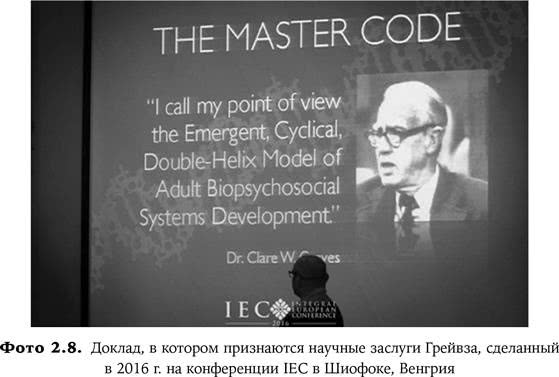 Бек пообещал Грейвзу, что продолжит его работу, и последние 50 лет занимался только этим. Грейвза с уважением вспоминают в академическом сообществе и признают тот вклад, который он внес в создание теории спиральной динамики. На фото 2.8 – доклад одного из ученых на 2-й Европейской конференции по интегральному мышлению (Integral European Conference, IEC) в Шиофоке, Венгрия, в 2016 г.