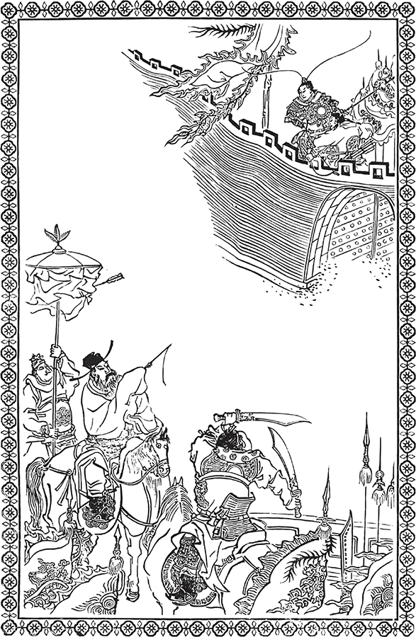 Прошло несколько дней. Цао Цао соорудил лагерь и, подъехав к городским стенам, стал вызывать Люй Бу. Тот поднялся на стену.