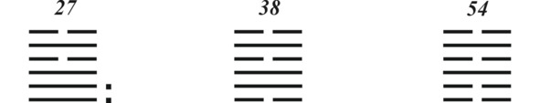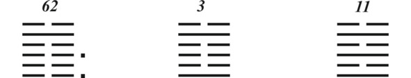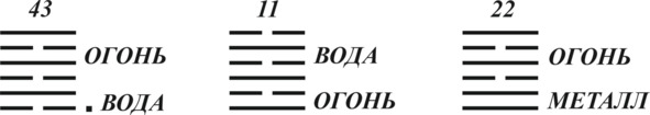 Я уже говорил, что в гадании монетами трудно получить гексаграмму со всеми изменяющимися линиями, равно как и фигуру без изменяющихся линий. Но все равно такие случаи происходят, и вот вам пример от моей жены. Ей нужно было определиться с трудовыми отношениями с пятью мужчинами. Я присутствовал при гадании. Для первого выпало: Гром – Гром; для второго: Земля – Земля; для третьего: Небо – Небо; четвертый: Гром – Гром и пятый: она – Гром, ее компаньон – Гора.