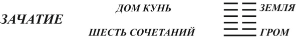 Параллельно с описанием питания и ростом плода: «,автор книги изложил ситуацию о сватовстве и женитьбе. Я предположил, что это мама нашего малыша вышла замуж, но только уже беременная. Родители молодого юноши и девушки обо всем договорились, и парень был вынужден выполнить волю старших. Это мельком показано в первом афоризме: .Брачный союз нужен был для усиления двух разрозненных племен, чтобы вместе противостоять набегам варваров. Молодой человек предпринял несколько попыток жениться: , но только последняя увенчалась успехом. В конце парень догадался, что его пассия беременная, о чем и идет разговор на шестой линии: . Но ничего не поделаешь, нужно выполнять волю родителей и ставить общественные интересы выше личных. Иероглиф изображает молодое растение, пробивающееся на поверхность земли. Все сущее в начале рождения. Дракон находится на мелководье»