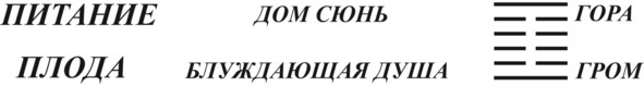 Главный герой книги зародился, и теперь идет процесс питания плода в утробе матери, о чем говорит основной иероглиф: .Ритуал по вызыванию души еще не закончился, и ученики, обладавшие даром ясновидения, смоглиувидеть зародыш: «…. Раньше для получения ответа использовали панцири черепах, поэтому здесь написано, что гадатели и наблюдают за зародышем в животике. Кроме этого они видели весь процесс жизни в утробе: Холмик» – это мамин животик, а «магистральный путь» – это то, что представляет собой тот свет. Но малышу было дискомфортно в новых условиях, и он не хотел их принимать: «Иероглиф изображает открытый рот» и изучить (проанализировать), как я двигаю челюстями» «отложили в сторону твою Священную Черепаху» «Питание вверх ногами. Удаляешься от магистрального пути и питаешься от холмика. Смотришь алчно, как тигр. Твои желания (аппетит) безудержные». « «Противишься вскармливанию. Не действуй так – не будет пользы».