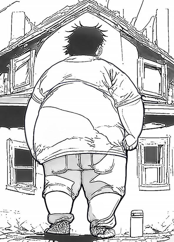 Из-за пушистого куста вылез толстый мальчишка, лет одиннадцати-двенадцати (Элиас). Лицо его, в холодном свете луны, казалось мертвенно бледным; волосы были всклокочены и видом своим напоминали потрёпанную мочалку. Стараясь ступать как можно тише, он подкрался к старому дому, внутри которого было темно и тихо.