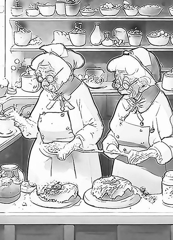 Две женщины лет семидесяти, судя по серебру волос и морщинам, бороздившим их щёки, делали необыкновенные пассы руками и на кухне происходили настоящие чудеса. Посуда кружила в воздухе; огонь в печи разговаривал человеческим голосом; крем взбивался в кастрюле сам собой; а тесто, без чьей-либо помощи, раскатывалось в тонкие коржи, которые плюхались на чугунные сковороды и поджаривались с обеих сторон.