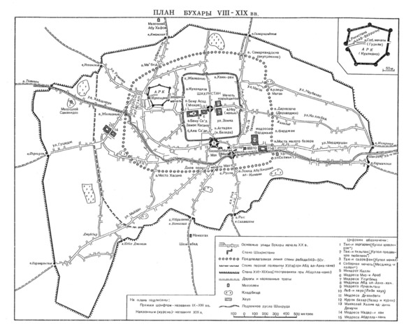 В середине IX века, при наместничестве Тахиридов (820—873 годы), вокруг Бухары была возведена внешняя стена. В её пределах находились: цитадель, шахристан, базар Мах, намазгах, и кладбище к северу от него, Кушки Муган, земли потомков Бухархудата и горожан на периферии обживаемой территории. Общая площадь города в пределах этих стен составляла более 700 гектаров.
