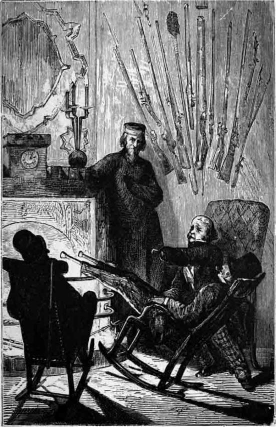 Salonun diğer ucunda, başkan ve dört sekreteri kocaman bir yükseltinin tepesinde yerlerini almıştı. Başkanın oturmakta olduğu koltuk, oymalı bir top arabasına konulmuştu ve görüntüsüyle 32 parmaklık, doksan derece dikilmiş ve kulplara asılı hantal bir havanı andırıyordu. Öyle ki çok sıcak havalarda başkan sallanan sandalyedeymiş gibi sallanarak ferahlayabilirdi. Altı adet kısa ve hafif top mermisinin üzerine oturtulmuş bir levhadan oluşan masada, gayet güzel oyulmuş bir İspanyol silahından bozma, çok zevkli bir mürekkep hokkası ve gerektiğinde bir silah kadar gür ses çıkartabilen bir çan bulunmaktaydı. Ama bu yeni moda çan bile hararetli tartışmalar esnasında gürültücü topçuların sesini bastırmaya yetmiyordu.