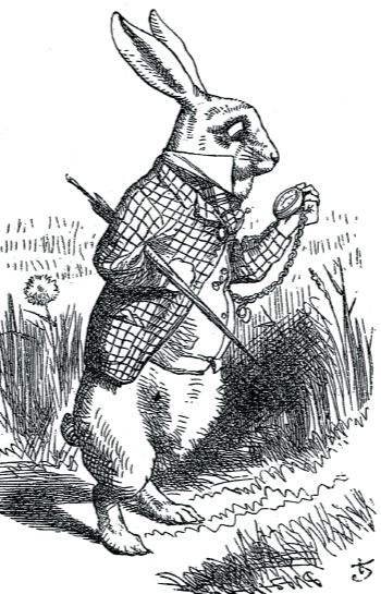 Yanına gelen Tavşan’ın “Hay Allah! Çok geç kalacağım!” diye kendi kendine konuşması başlangıçta Alice’e garip gelmemişti. Oysa daha sonra bunu düşündüğünde aslında Tavşan’ın konuşmasının ne kadar tuhaf olduğunu fark edecekti ama nedense o an, bu, ona çok doğal gelmişti. Tavşan, yeleğinin cebinden çıkardığı bir saate bakıp aceleyle uzaklaştı. Alice daha önce ne cepli bir yeleği olan ne de o cepten bir saat çıkarıp merakla bakan bir Tavşan görmediğini fark etti. Bir anda ayağa fırlayıp Tavşan’ın arkasından koşarak gitti ve son anda onun, bir çitin altından geçerek geniş bir deliğe doğru süzüldüğünü gördü.