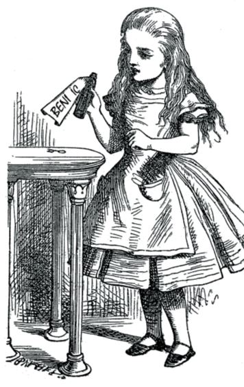 Şişede BENİ İÇ yazması çok güzel bir şeydi elbette ama akıllı küçük Alice hemen içmedi şişenin içindeki şeyi. Daha önce, çocukların yakılıp vahşi canavarlar tarafından yenildiğini anlatan birçok hikâye okuduğundan Yok, en iyisi önce zehirli mi değil mi diye emin olayım, diye düşündü. Bu tür şeyleri arkadaşlarıyla hep konuşurlardı: “Eğer eline sıcak bir maşa alırsan elini yakar… Eğer parmağını bıçakla çok derinden kesersen çok kan akar…” gibi basit kuralları hatırlamamaları sonucu başlarına türlü felaketler gelirdi çocukların. Şimdi o da üzerinde “zehir” yazılı bir şişeden içerse ne olacağını az çok kestirebilirdi.