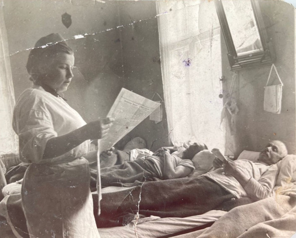старшая сестра госпитального взвода 389-го медсанбата лейтенант Шигина читает раненому солдату газету 1943 год