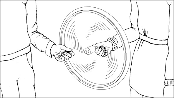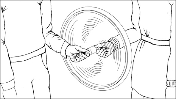 Mom takes on her side of the axis. Fred once again spins the wheel. He removes his fingers from his end of the axis. The wheel is held on one mother’s index finger. Wheel retains upright position. Fred shows his hands.