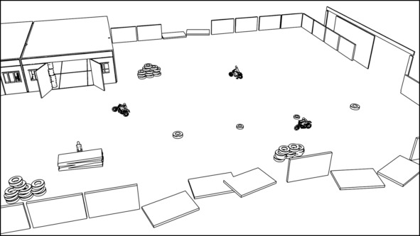 Time for Fred starts to flow at a normal pace. He looks at the torn drawings. Smiles after a bully. He quickly gets to his feet, picks up his motorcycle, jumps on it, and presses the start button. Motorcycle does not respond. Fred tries to push buttons to turn the throttle. He looks at the control knobs, sees the wires torn off.