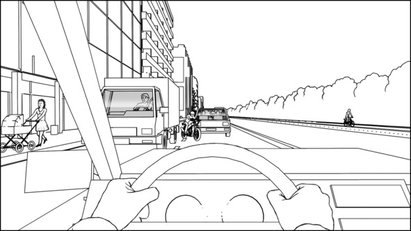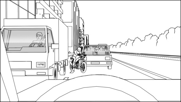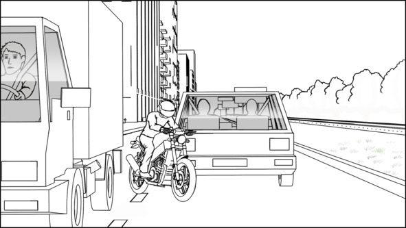At that moment, when the truck and the wagon just passed each other, through the gap between them, into the driver’s lane, a motorcycle flies at a breakneck speed.