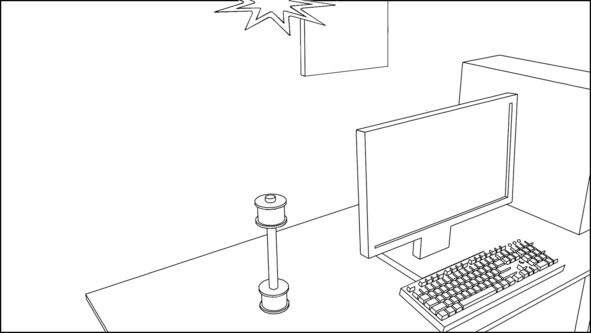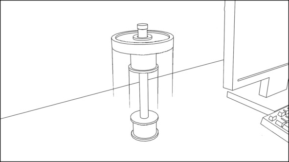 Fred walks over to the dumbbells, and takes one small dumbbell disc. He returns to the table and puts the disk on the top spool. The coil under the weight of the disc drops slightly and hangs slightly lower than before. Fred slowly rotates the regulator, reducing the voltage. The upper disc coil slowly descends. Fred turns the regulator very quickly in the opposite direction.