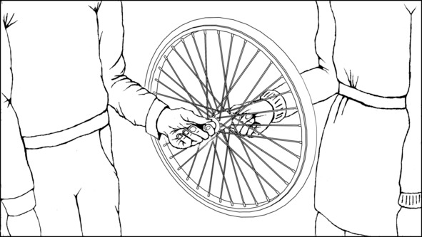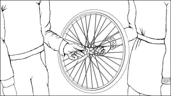 Mom gently removes the thumb. The axis remains to lie on his index finger. Fred raises his side of the axis. The end of the axis, lying on the mother’s index finger, rises up. The wheel rises, maintaining the horizontal position of the axis and the vertical position of the wheel itself.