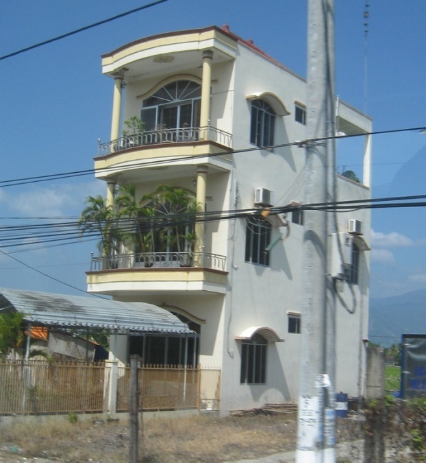 Архитектура сильно отличается от вьетнамской, у которой дома были узкими и длинными из-за большого налога на фасад. Как правило, вьетнамский дом не страдал изысками, а имел просторную переднюю часть для гостей с алтарем,за ним шла комната родителей, дальше – детей и последней была кухня. Если смотреть сбоку на этот дом, то он напоминает сарай с широкой дверью и крышей .В городах дома многоэтажные, но все равно узкие.