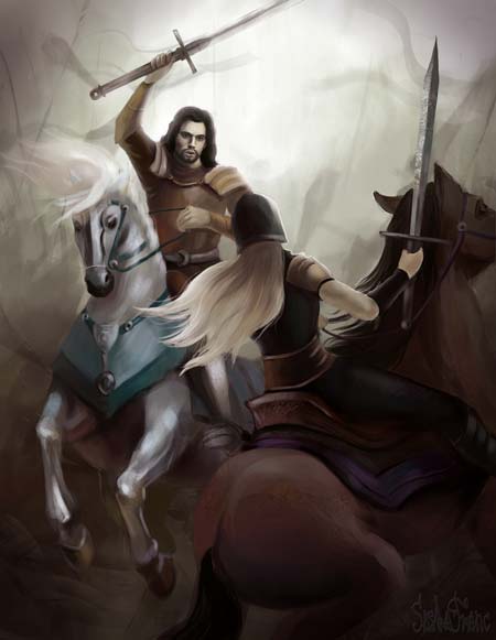 Маатхас растерялся. Он, конечно, признавал мастерство Бану, но не желал посрамить её перед отцом и будущими подданными. Ситуация превращалась в сложную задачу – сражаться с тану не хотел, да только как отказаться от боя, не обидев таншу, Яввуза и всех пурпурных? Сагромах обратился глазами к Сабиру – тан лишь в недоумении развел руками. Пока Маатхас размышлял, как быть, Бану, ткнув коня пяткой, занесла меч.