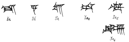 В клинописном письме очень немногие слоги имеют единственный вариант записи. По историческим причинам большинство слогов имеют по нескольку соответствующих им знаков, а для некоторых слогов число таких вариантов довольно велико. Например, для слога ша теоретически можно использовать любой из следующих шести знаков, а может быть, и некоторые другие: