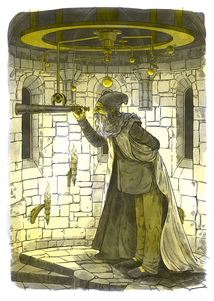 Ночь напролёт в башне горит огонь. Седой старик обходит окна и смотрит в каждое через подзорную трубу. За окнами кромешный мрак. Обычный человек в них ничего бы не увидел, будь он даже зорче орла. Но старик смотрит в свою трубу, вращая её, как калейдоскоп. И видит не тьму и не стеклянные узоры, а отдалённые места, людей, события.