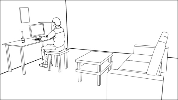 Камера компьютера сканирует мастерскую и лицо Фреда. На мониторе виден процесс сканирования мастерской и физиономии Фреда, чуть ниже виден текст вопроса и варианты ответов. Компьютер перебирает варианты ответов. Лео – компьютер, нейронная сеть, обладающий искусственным интеллектом.