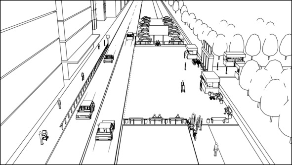 Городская, с двухсторонним движением улица. С одной стороны этой улицы тротуар, примыкающий прямо к проезжей части. Тротуар отделён от проезжей части заграждением.