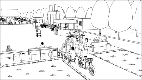 С другой стороны дороги площадка входа в городской парк. На площадке находятся ворота, за которыми начинается аллея, уходящая в глубину парка. Площадка отгорожена от газонов небольшим забором. В этом заборе есть один проём, там, где к площадке примыкает тротуар.
