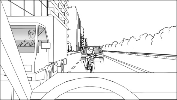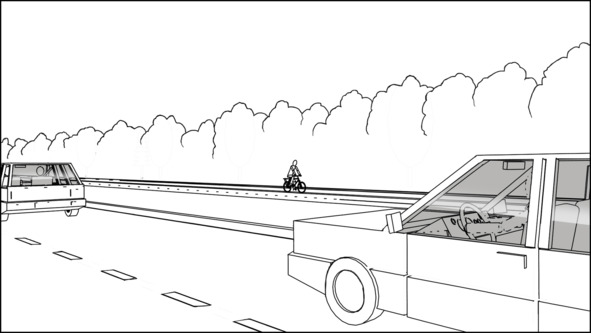 Мотоциклист приближается к толпе на большой скорости. Прохожие в панике толкают друг друга. Потерявший равновесие человек, толкает сидящую на стуле девушку. Девушка падает на траву. Кто-то, в суматохе, отходя задом, спотыкается об бордюр и валится на землю. Кто-то выбивает из рук Фреда планшет с незаконченным портретом.