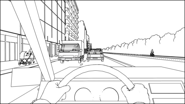И только в этот момент, водитель, опомнившись, жмёт на тормоз и судорожно крутит баранку вправо, поворачивая к обочине. Сзади слышится визг тормозов.