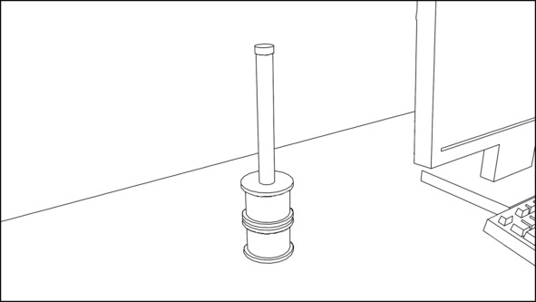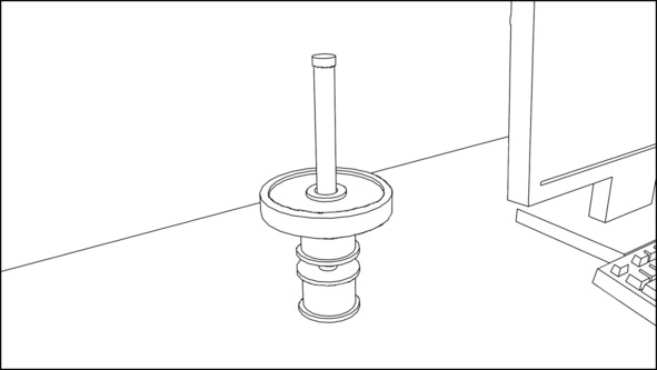Мама осторожно убирает большой палец. Ось остаётся лежать на его указательном пальце. Фред поднимает свою сторону оси. Конец оси, лежавший на указательном пальце матери, поднимается вверх. Колесо поднимается, сохраняя горизонтальное положение оси и вертикальное положение самого колеса.