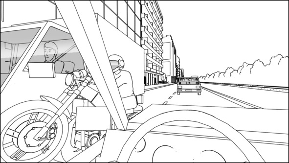 Мотоциклист, чуть сбавив скорость, проезжает по освободившемуся тротуару. Фред видит всё происходящее в сильно замедленном темпе. Такой эффект бывает в кино, когда действие показывают очень медленно.