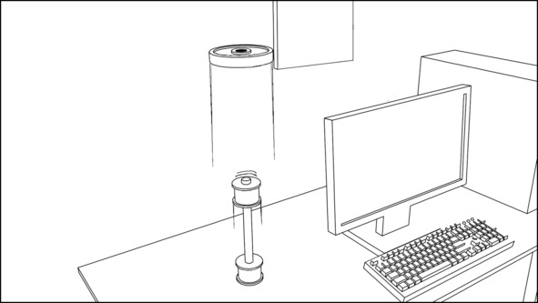 Фред показывает, стоящий на столе прибор. На столе, одна поверх другой, лежат две электромагнитные катушки. Катушки надеты на длинный стержень с упором-ограничителем в верхней части. Верхняя катушка имеет возможность свободно двигаться по стержню, вверх до упора. Фред включает прибор.