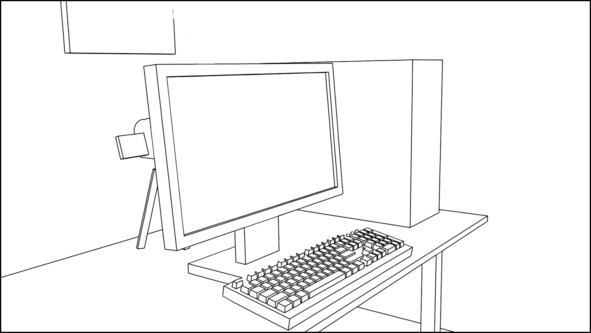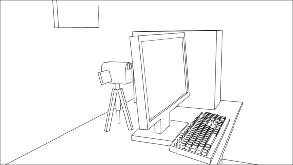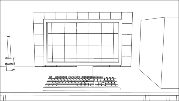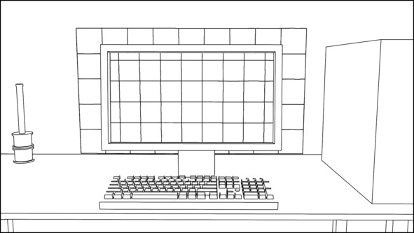 Фред садится за стол, сидит и смотрит на порванные рисунки. Он расстроен. Не зная, что делать, он поворачивается к своему рабочему компьютеру. С бессмысленным взглядом он «листает» рисунки на экране монитора. На экране появляется рисунок немного похожий на текстуру стены мастерской, находящуюся за монитором. Он пролистывает этот рисунок. Останавливается. Задумывается. Возвращается к рисунку, похожему на стену мастерской. Несколько раз переводит взгляд с монитора на стену и обратно. Лицо озаряется.