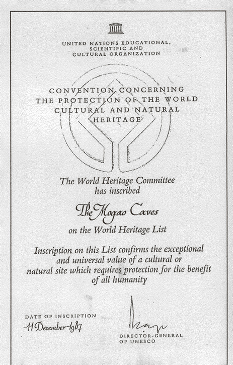 Свидетельство о присвоении пещерам Могао статуса объекта Всемирного наследия ЮНЕСКО