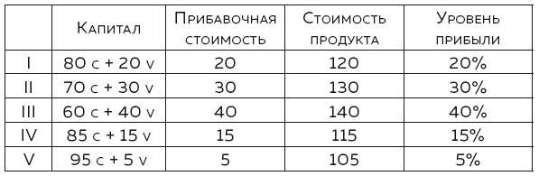 Итак, в пяти различных отраслях мы, при одинаковом использовании труда, получили очень различные уровни прибыли.