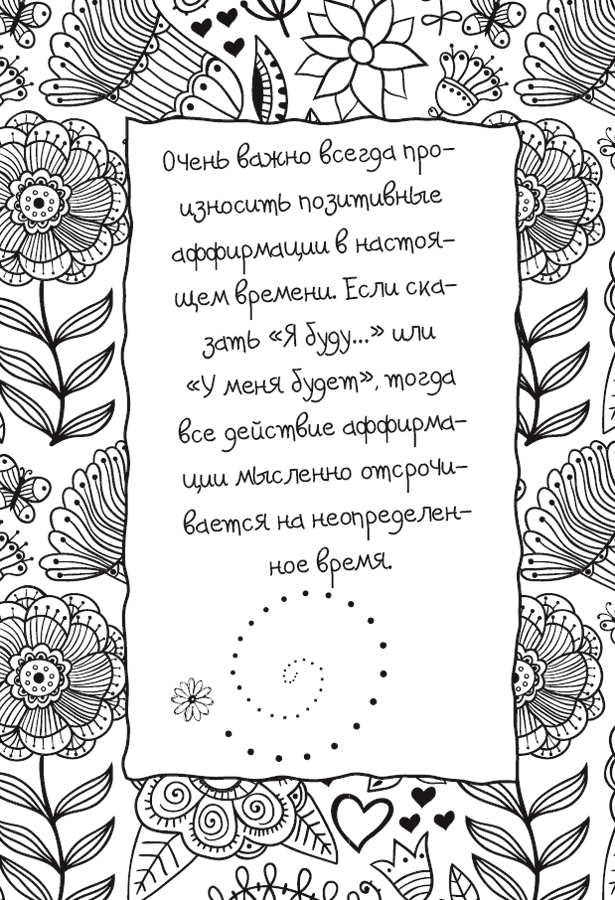 Очень важно всегда произносить позитивные аффирмации в настоящем времени без сокращений (хотя в книгах я постоянно пользуюсь сокращениями, но в позитивных аффирмациях их избегаю, чтобы не снижать действенность этих утверждений). Например, наиболее типичные аффирмации начинаются со слов: «Я уже» или «У меня есть…» Если сказать «Я буду…» или «У меня будет», тогда все действие аффирмации мысленно отсрочивается на неопределенное время. Вселенная воспринимает ваши мысли и слова слишком медленно и дает вам желаемое, ориентируясь на сказанное вами самими. Всегда. Вот еще одна причина поддерживать оптимистическое восприятие действительности, радостную ментальную атмосферу. Легче мыслить позитивными утверждениями, когда вам хорошо.