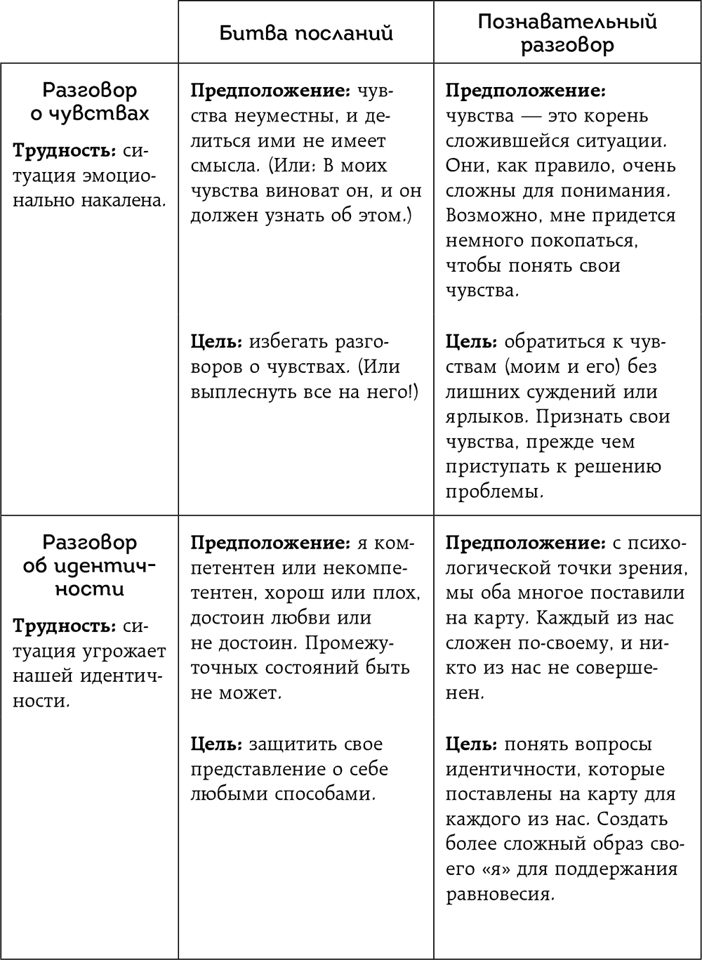 Как только вы поймете, какие сложности скрываются за этими тремя разговорами и какие ошибки мы при этом совершаем, то, вероятно, обнаружите, что ваши цели в каждом из них начинают меняться. Вы начнете понимать всю сложность связанных с ними восприятий и намерений, свое участие в возникновении проблемы и то, какими последствиями эти проблемы могут обернуться для самооценки и идентичности каждого человека. Вы увидите, насколько важную роль во всем этом играют чувства. А еще вы обнаружите, насколько бессмысленно пытаться просто донести до людей информацию. На самом деле, возможно, вы обнаружите, что вам больше нечего «доводить до сведения». Вместо этого вам захочется поделиться интересной информацией и задать определенные вопросы.