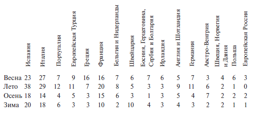 Отсюда видно, что у 9 народов, а между ними особенно у южных, первое место в этом отношении занимает лето. У 4 других, преимущественно северных, – весна. В одной стране (Австро-Венгрия) первенство принадлежит осени, а в другой (Швейцария) – зиме. За исключением двух случаев, весной всегда бывает больше политических преступлений, чем осенью. Кроме того, мы находим, что в 5 случаях, главным образом в странах наиболее теплых, зима превосходила осень по числу политических преступлений, в 8 случаях – уступала ей и в 3 – была равна.