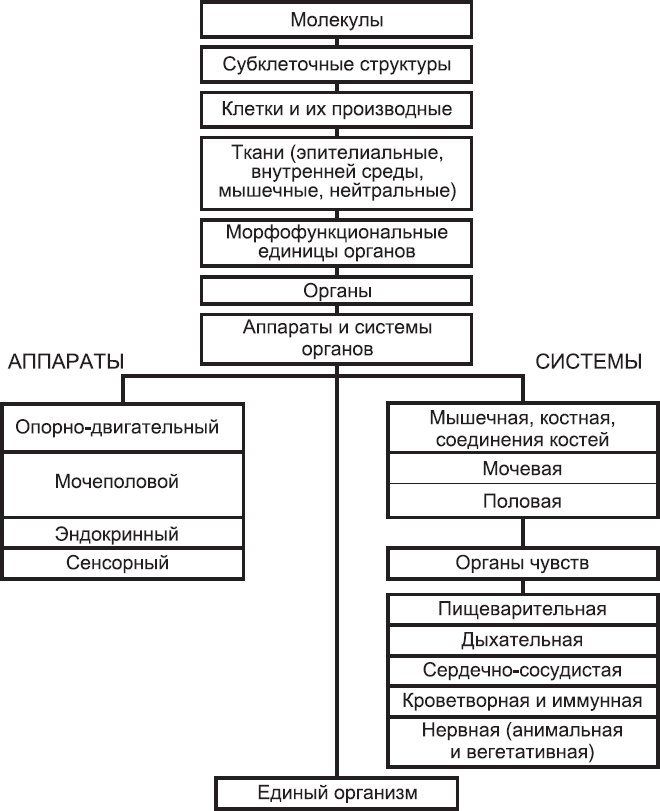 Некоторые системы объединяются по функциональному принципу в аппараты: они зачастую имеют различное строение и происхождение, могут быть не связаны анатомически, но их объединяет участие в выполнении общей функции (например, опорно-двигательной), либо эти органы различны по своим функциональным задачам, но связаны единым происхождением (например, мочеполовой аппарат).