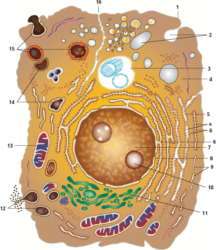 1 – цитолемма (цитоплазматическая мембрана); 2 – пиноцитозные пузырьки; 3 – центросома (клеточный центр; цитоцентр); 4 – гиалоплазма; 5 – зернистая эндоплазматическая сеть: а – мембрана зернистой сети, б – рибосомы; 6 – связь перинуклеарного пространства с полостями эндоплазматической сети; 7 – ядро; 8 – ядерная пора; 9 – незернистая (гладкая) эндоплазматическая сеть; 10 – ядрышко; 11 – внутренний сетчатый аппарат (комплекс Гольджи); 12 – секреторные вакуоли; 13 – митохондрия; 14 – лизосомы; 15 – три последовательные стадии фагоцитоза; 16 – связь клеточной оболочки (цитолеммы) с мембранами эндоплазматической сети