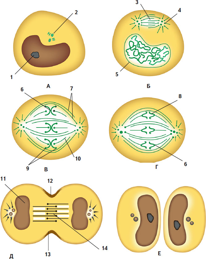 А – интерфаза; Б – профаза; В – метафаза; Г – анафаза; Д – телофаза; Е – поздняя телофаза; 1 – ядрышко; 2 – центриоли; 3 – веретено деления; 4 – звезда; 5 – ядерная оболочка; 6 – кинетохор; 7 – непрерывные микротрубочки; 8, 9 – хромосомы; 10 – хромосомные микротрубочки; 11 – формирование ядра; 12 – борозда дробления; 13 – пучок актиновых нитей; 14 – остаточное (срединное) тельце (по А. Хэму и Д. Кормаку, с изменениями)