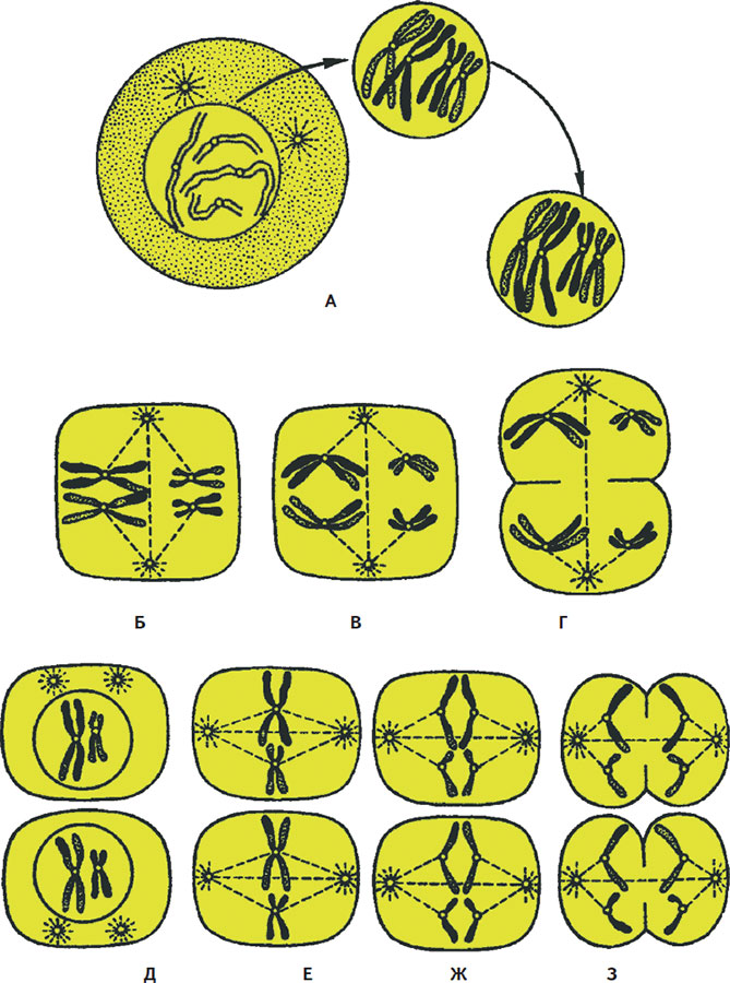 А – профаза I; Б – метафаза I; В – анафаза I; Г – телофаза I; Д – профаза II; Е – метафаза II; Ж – анафаза II; З – телофаза II