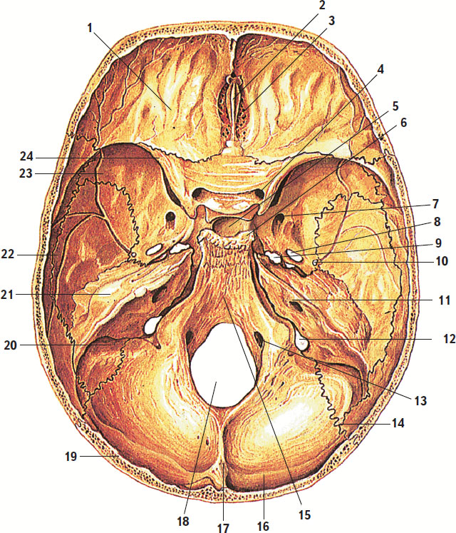 1 – глазничная часть лобной кости; 2 – петушиный гребень; 3 – решетчатая пластинка; 4 – зрительный канал; 5 – гипофизарная ямка; 6 – спинка седла; 7 – круглое отверстие; 8 – овальное отверстие; 9 – рваное отверстие; 10 – остистое отверстие; 11 – внутреннее слуховое отверстие; 12 – яремное отверстие; 13 – подъязычный канал; 14 – ламбдовидный шов; 15 – скат; 16 – борозда поперечного синуса; 17 – внутренний затылочный выступ; 18 – большое (затылочное) отверстие; 19 – затылочная чешуя; 20 – борозда сигмовидного синуса; 21 – пирамида (каменистая часть) височной кости; 22 – чешуйчатая часть височной кости; 23 – большое крыло клиновидной кости; 24 – малое крыло клиновидной кости